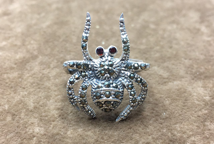 | This vintage spider ring is made out of solid sterling silver with marcasite and garnet in the eyes.