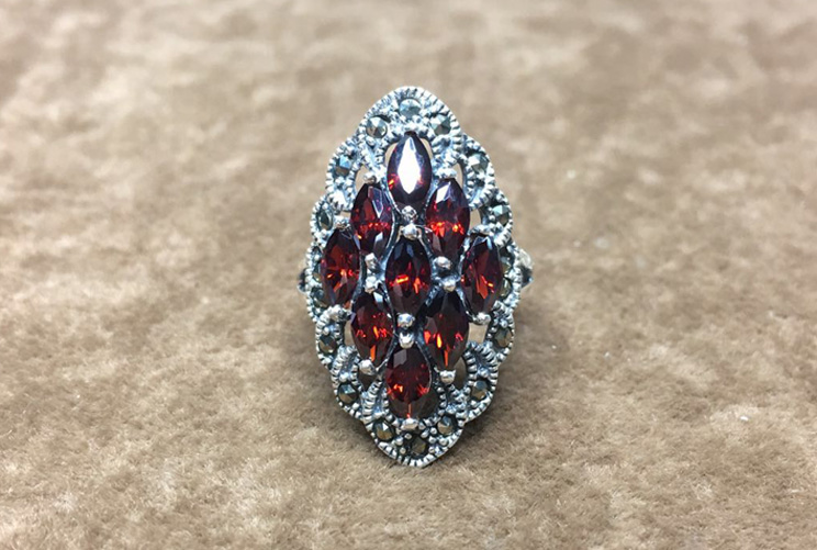 | This vintage garnet ring is made out of solid sterling silver with marcasite and marquise garnets set in the middle.