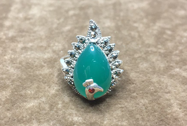 | This vintage phoenix ring is made out of solid sterling silver with marcasite on the feather and jade forms the body.
