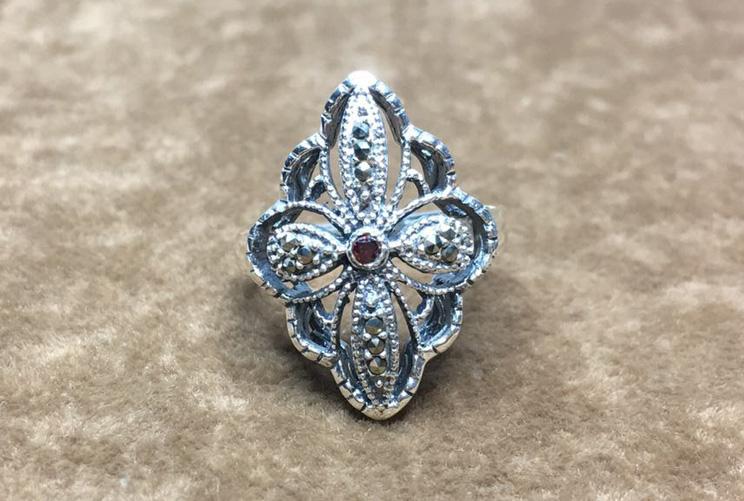 | This vintage cocktail ring is made out of solid sterling silver with marcasite and garnet set in the center.