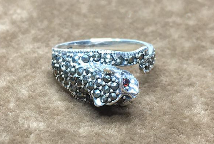 | This vintage leopard ring is made out of solid sterling silver with marcasite on the body and garnet set on the eyes.