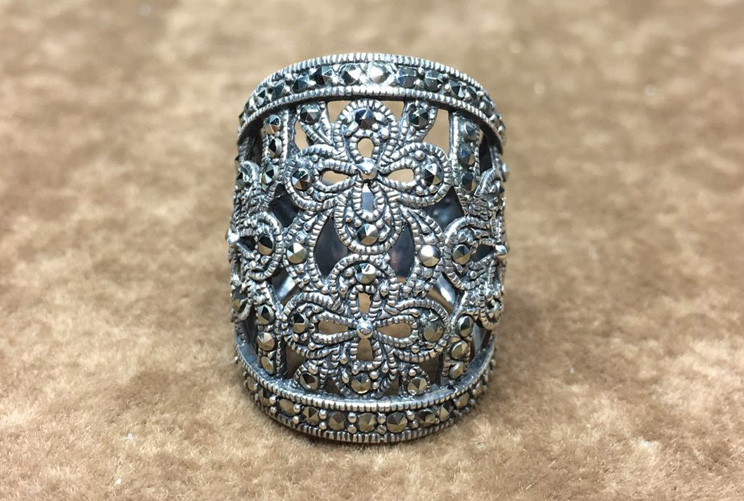 | This antique silver ring is made out of solid sterling silver with marcasite on the body.