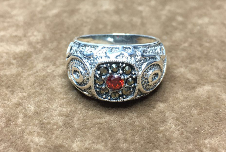 | Antique silver ring made out of solid sterling silver with marcasite around garnet on top.