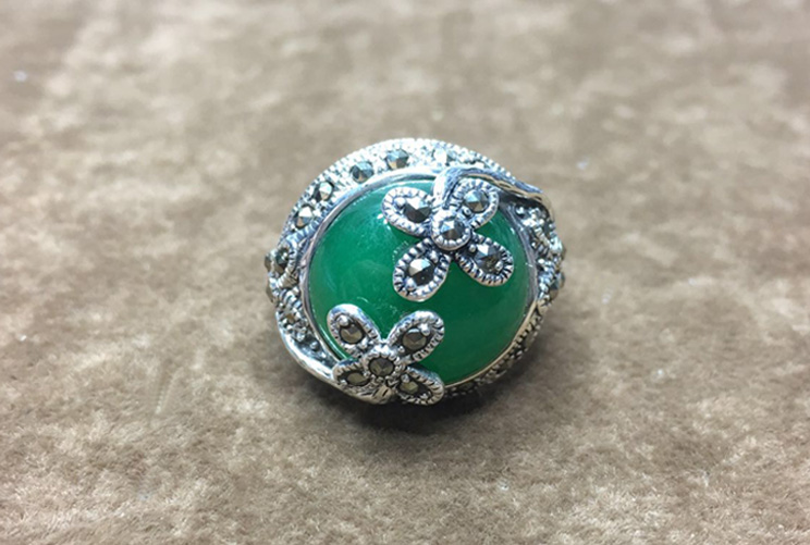 | This elegant vintage jade silver ring is made out of solid sterling silver with marcasite.